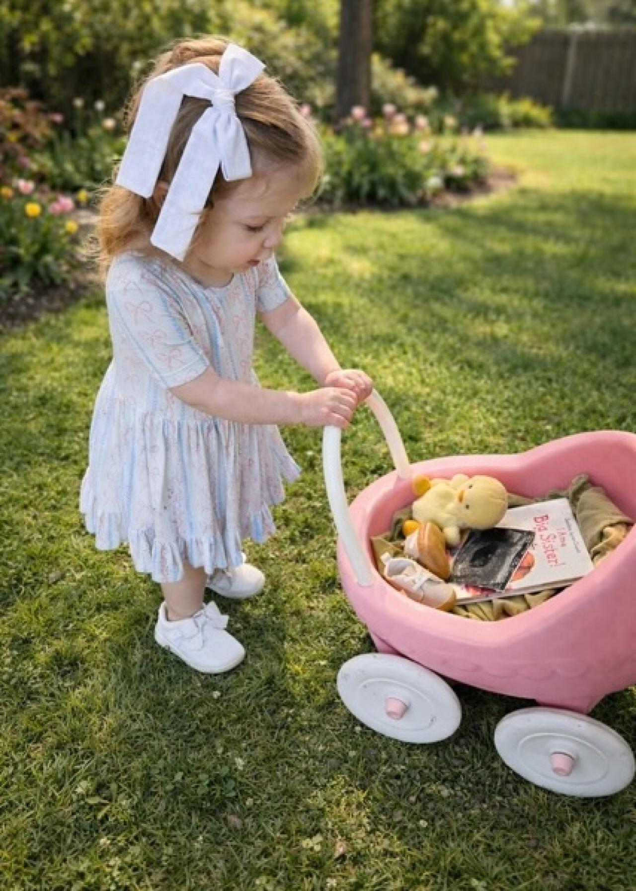 Leighton was also born in the fall, so it will be an even sweeter, celebratory season for the family moving forward. Liz and Brice shared a cute pic of Leighton pushing a stroller filled with some big sister goodies, including her baby sibling's sonogram, a chick plushie, a book, and a beige pair of shoes.