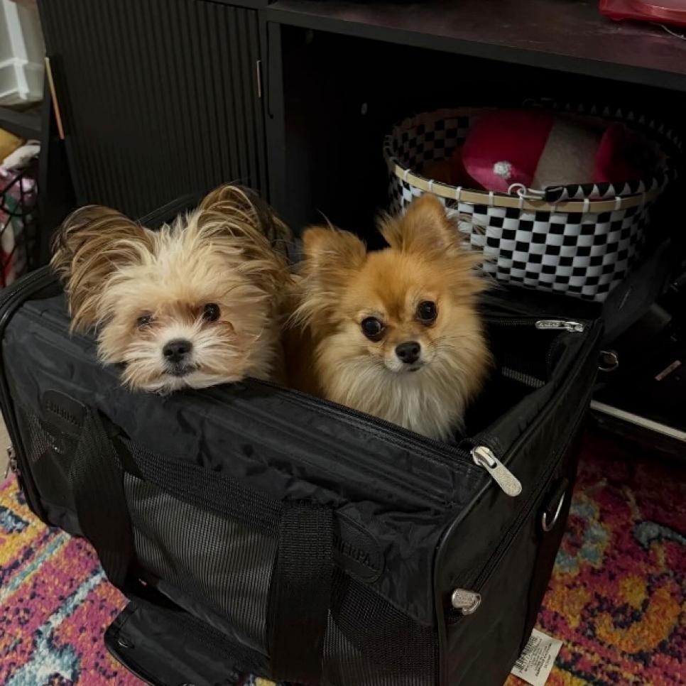 Pups on the go! They looked so cute tucked into this pet carrier.