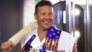 Buddy makes a giant hot dog cake for the famous hot dog eating contest.