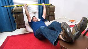 A mother uses a sporting good store's exercise equipment to avoid the gym.